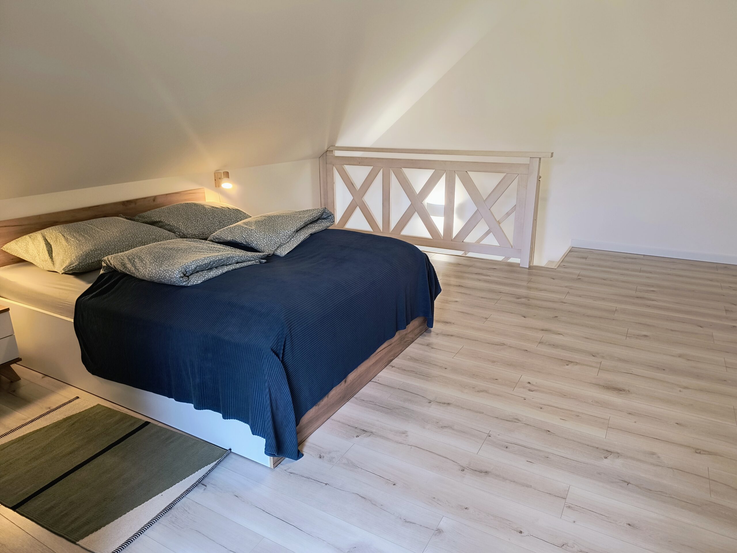 Na piętrze (wejście schodami) znajduje się przestronna sypialnia dla czterech osób. Wygodne dwuosobowe łóżko oraz rozkładana sofa zapewniają komfortowy sen po dniu pełnym atrakcji.