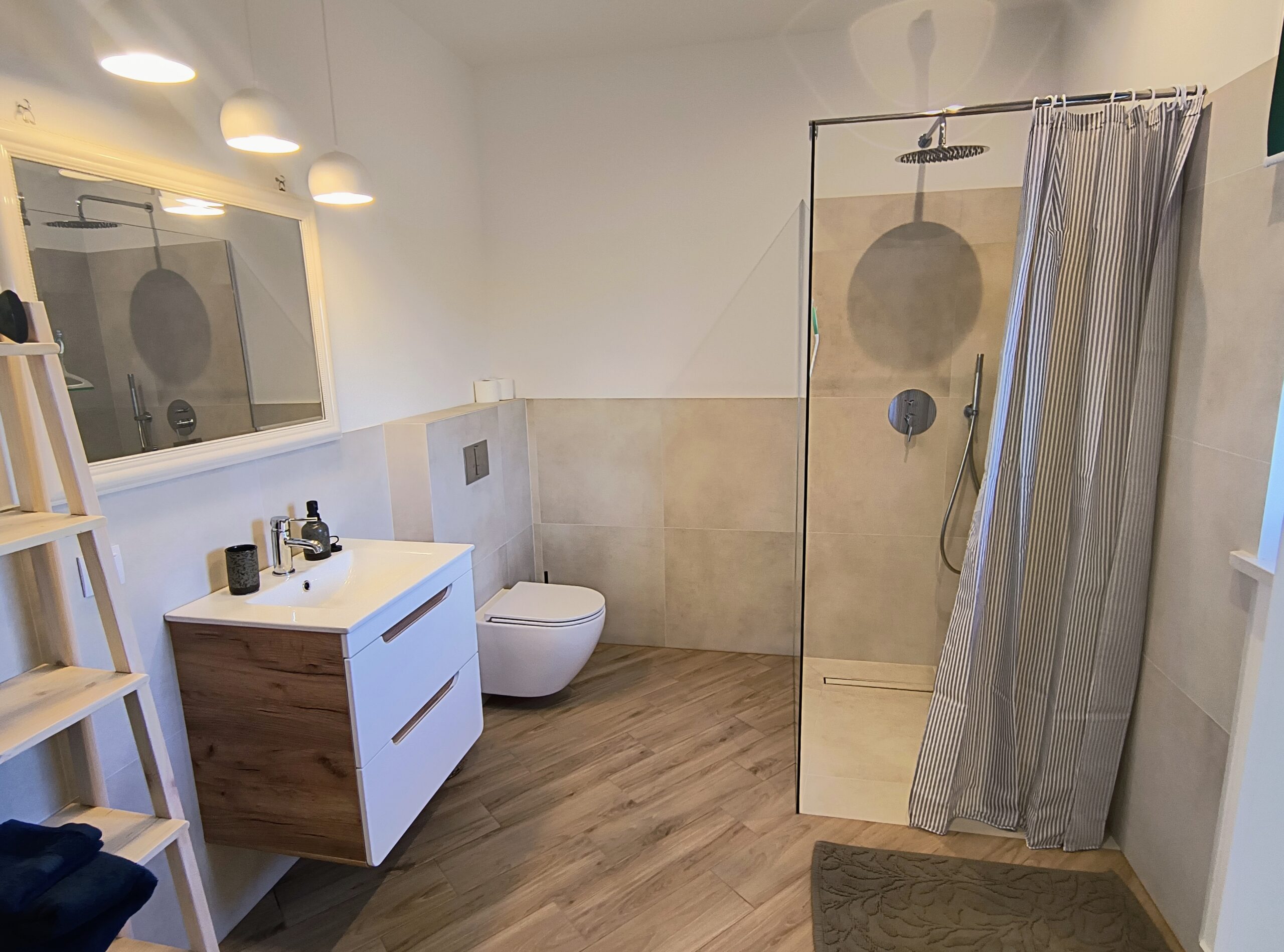 W naszych domkach na parterze czeka na Ciebie przytulna strefa wypoczynkowa z kominkiem typu koza – idealna na chłodniejsze wieczory. Obok znajduje się kącik jadalny oraz w pełni wyposażony aneks kuchenny: zmywarka, lodówka, płyta grzejna, czajnik i ekspres do kawy. Na tym poziomie znajduje się także łazienka z prysznicem. Z salonu można wyjść prosto na taras z meblami ogrodowymi, by cieszyć się poranną kawą lub kolacją na świeżym powietrzu.